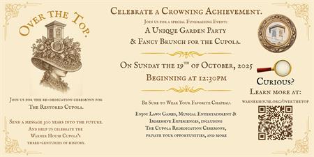 Grab your favorite chapeau and please join us for a special fundraising event and re-dedication ceremony to celebrate the Warner House Cupola on Sunday, October 19th. This unique garden party will feature a fancy brunch and cocktails, lawn games, musical entertainment, immersive experiences, private tours, and more. All proceeds support the Cupola Project.